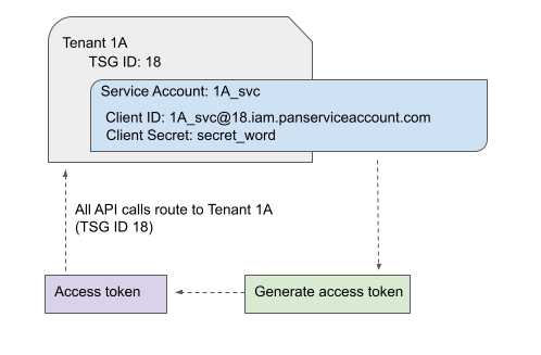 You use a service account to identify the tenant service group (TSG) to which you want to perform API access. If the TSG or tenant does not have a service account, then you cannot perform API access against it. This is a 1:1 relationship. That is, if you have a tenant, Tenant 1A, with a service account named 1A_svc, then you use that service account to obtain an access token. That access token cannot be used to perform API calls against any other tenant. All API requests made using that access token are routed to the tenant based on the TSG ID contained in the access token.