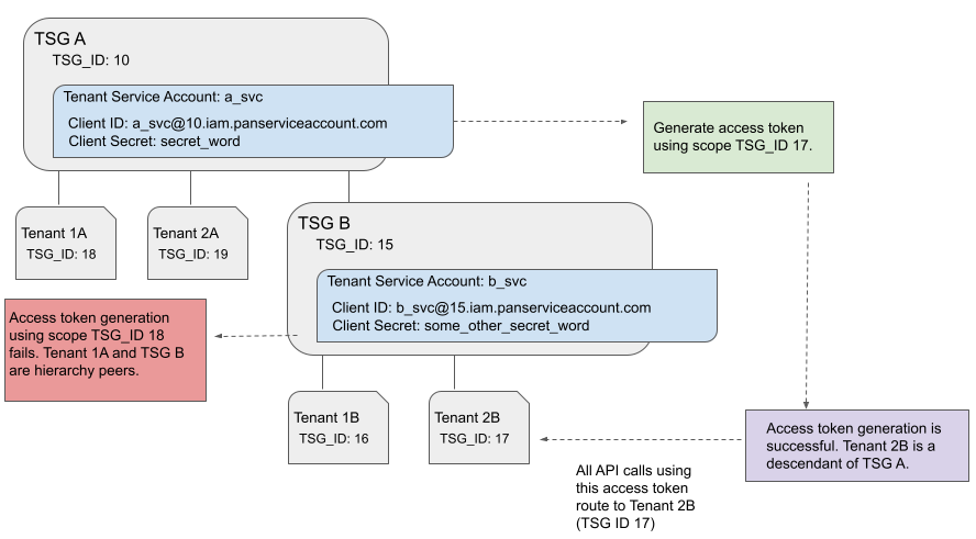 • a_svc service account can be used to create an access token that specifies any TSG_ID in the hierarchy, because every tenant and TSG is a child of TSG A.